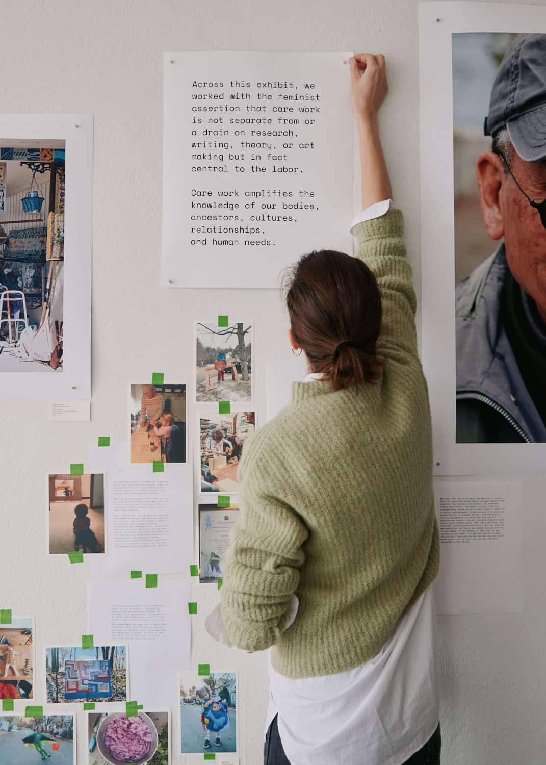 CAMERON + MEI: "To share the art of caregivers, we couldn't take a one-size-fits-all approach. Their work happens in so many different mediums, from food to song, teaching to tending plants, puppet shows and imaginative play, storytelling, upcycling, and repair. We anchored the show by focusing on eight people we were able to photograph, using text and QR codes and collaging archival images of their work to let the audience peek into full complex lifelong creative practices. We also asked our community to share work they might know about from their own lives, and then worked with those who responded to develop text, and share recordings and scans. We let those fill out, change, and grow the narrative we had the bones of from our first round of research and documentation. At the gallery, we have a printer and mounting and labeling material available so that visitors can help us build this important archive."
