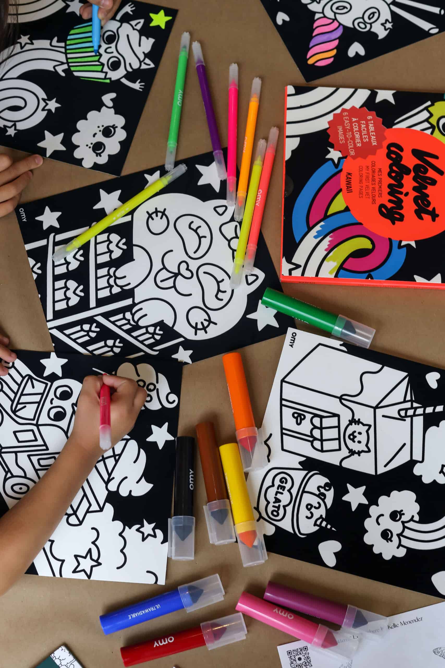 - OMY's Velvet Coloring kits come in four fun themes.