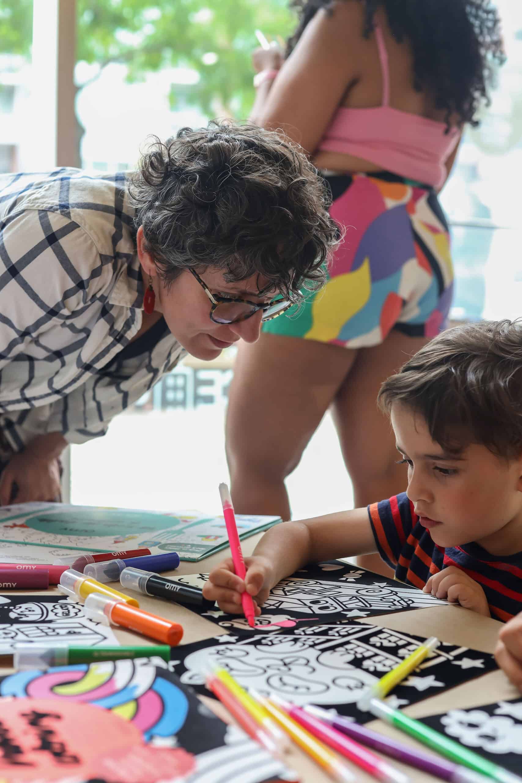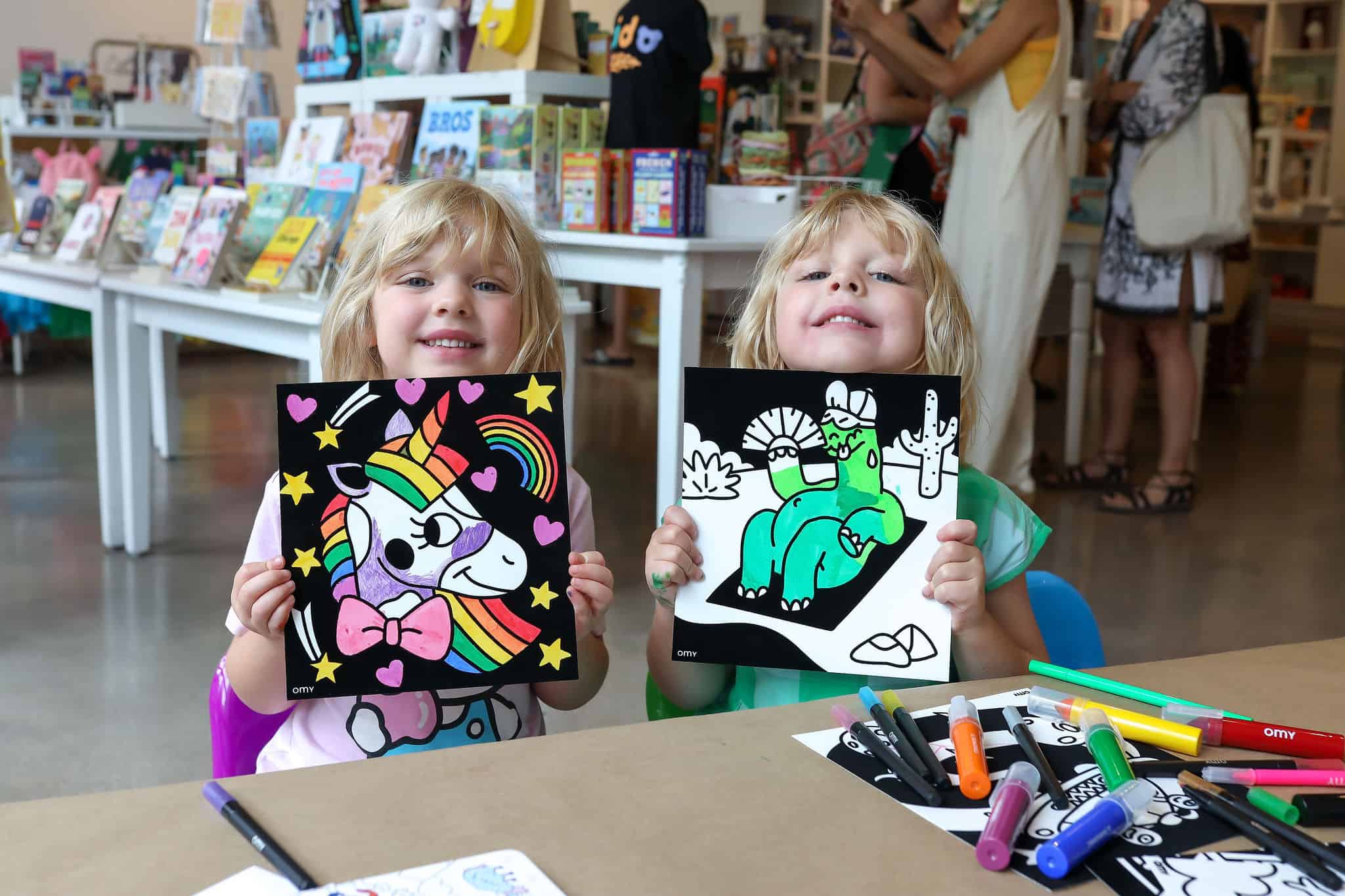 In addition to enjoying interactive book readings with Kellie + Kat, the many kidos (and mamas) in attendance came decked out in patterns and added extra flare with nail stickers and tattoos by OMY, and created mini-masterpieces with OMY‘s velvet coloring sheets and other art projects.