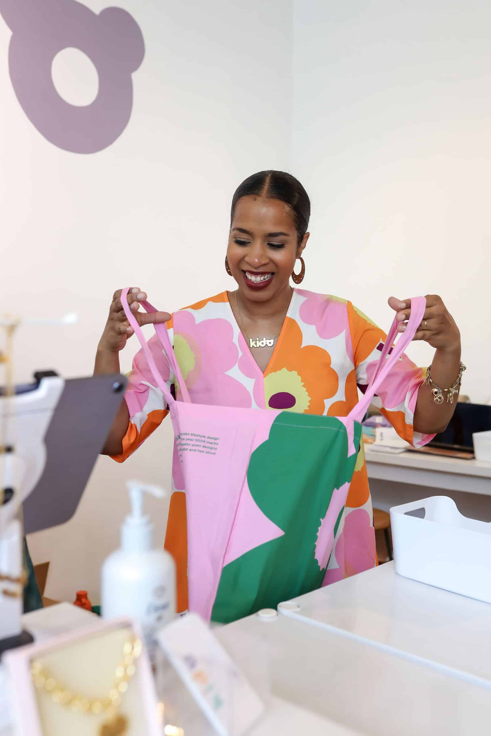 - Emory matching perfectly with her Marimekko gift bag.